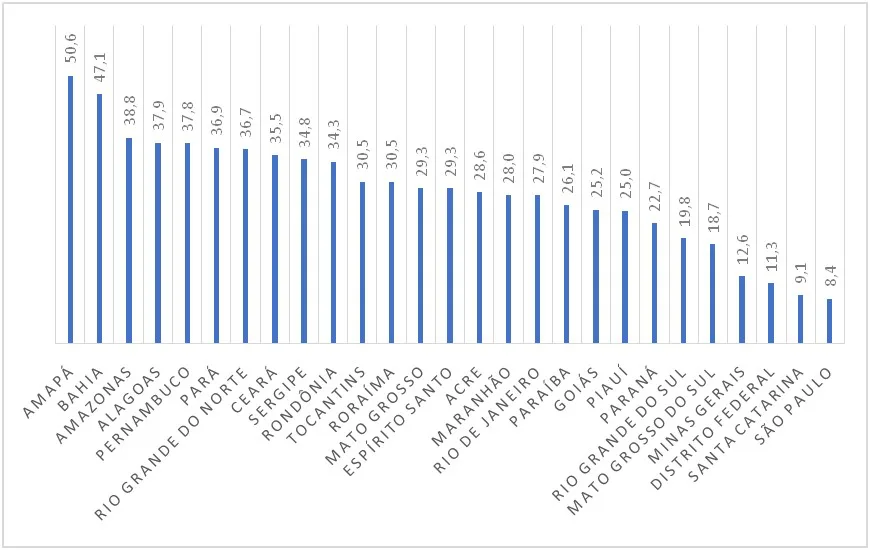 Isso fica visível no Amapá, com taxa de 50,6 MVI por cem mil habitantes foi, também, a unidade federativa de maior GPCSP. Do outro lado, São Paulo, que teve a menor taxa de MVI, com 8,4/100 mil – que junto de Santa Catarina, com taxa de 9,1, foram os únicos a manter a violência sobre controle –, também apresentou um dos mais baixos indicadores de gastos públicos.