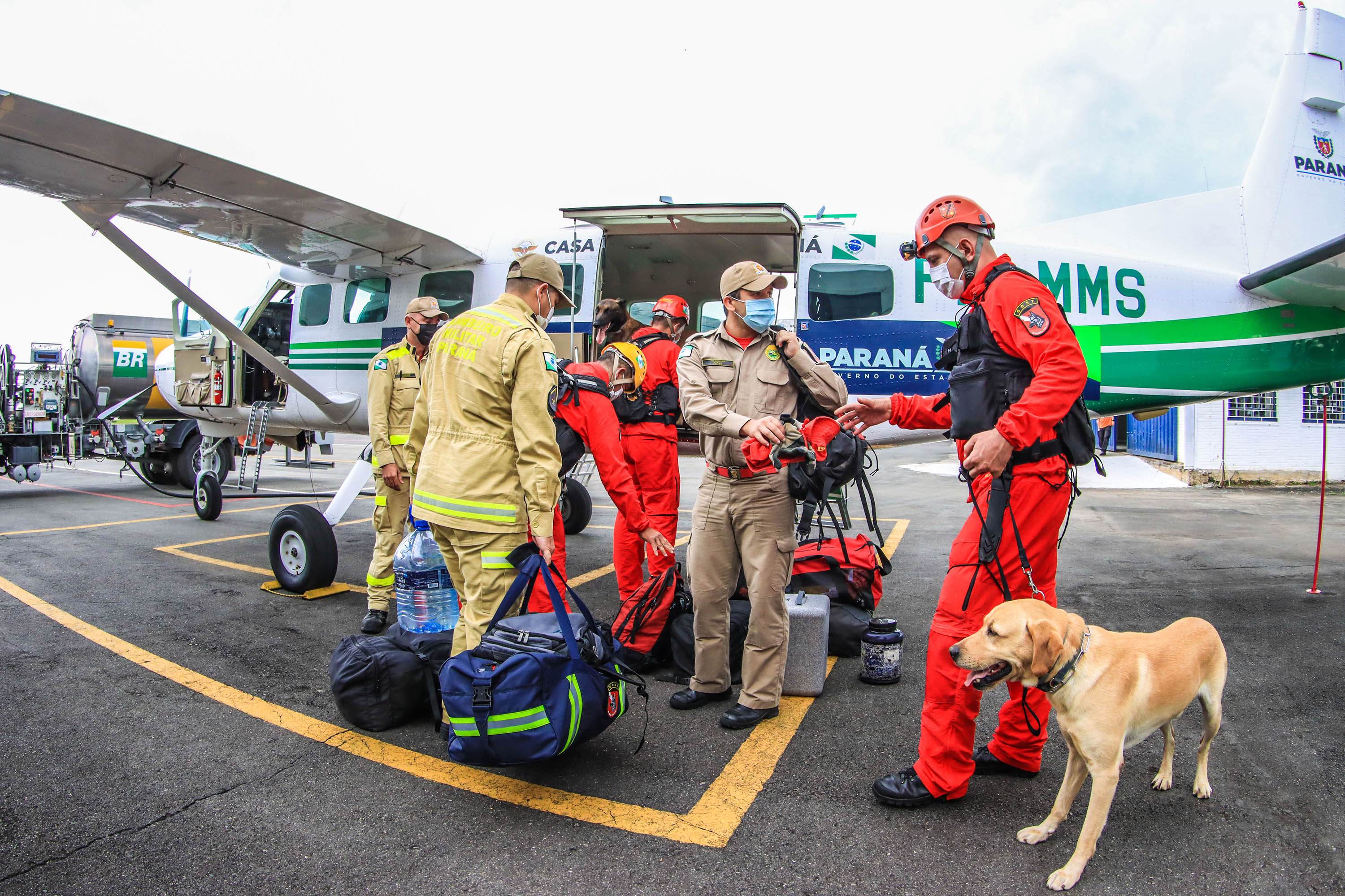 A primeira equipe saiu pela manhã, via terrestre, da sede do Grupamento de Socorro Tático, no bairro Cajuru, em Curitiba. Outro grupo seguiu no fim da tarde, em um avião do governo do estado, partindo do Aeroporto do Bacacheri, em Curitiba. Foram dez militares, três viaturas e quatro cães de faro especializados em busca de vítimas.