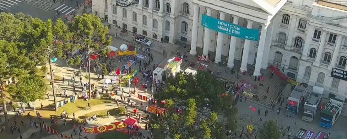 Assim como em outras cidades brasileiras, municípios do Paraná registraram neste sábado (24) atos contra a gestão do presidente da República Jair Bolsonaro (sem partido) e em defesa da vacinação contra a Covid-19. Em Curitiba, o protesto ocorreu durante a tarde e foi convocado por partidos de oposição ao governo federal, centrais sindicais, movimentos sociais. Os manifestantes se concentraram na Praça Santos Andrade, no Centro da capital. De acordo com o G1, também houve protestos contra Bolsonaro em cidades do interior, como Guarapuava, Ponta Grossa, Foz do Iguaçu, Maringá, Londrina, Umuarama e Cascavel. Em Curitiba, também houve uma manifestação a favor de Bolsonaro: motociclistas percorreram as duas pistas da BR-277 com bandeiras do Brasil, escoltados por policiais rodoviários.