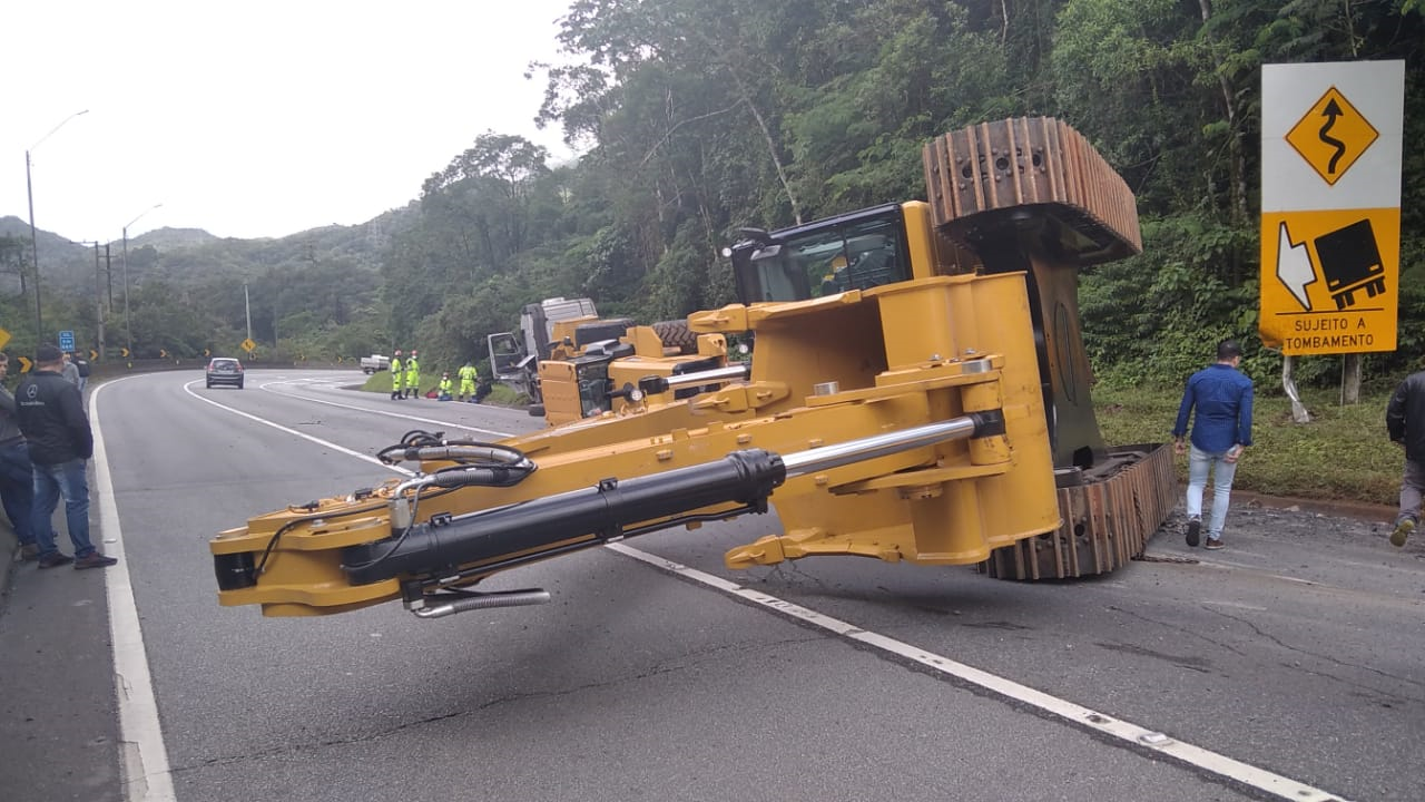 Uma escavadeira hidráulica caiu do caminhão em que era transportada na manhã desta sexta-feira (30) no km 665 da BR 376, em Guaratuba, no trecho entre Curitiba e Joinville. O acidente provocou interdição total da pista no sentido sul da rodovia. Equipes da concessionária Litoral Sul e da Polícia Rodoviária Federal prestam atendimento no local, que formou fila de 14 km. Às 12h16, segundo a PRF, a escavadeira foi retirada da pista e todas as vias liberadas. A carreta que levava o maquinário tem placa de Uberlândia (MG).