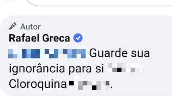 Ao responder outro internauta que o chamou de “Rafael Greca Dória de Macedo”, em referência ao governador de São Paulo, João Dória (PSDB), inimigo político de Bolsonaro e a quem o Butantan está vinculado, o prefeito agiu da mesma forma, usando o nome de um dos remédios sem eficácia contra a Covid-19 para rebater a provocação. “Guarde sua ignorância para si, [nome da pessoa] Cloroquina”, publicou.