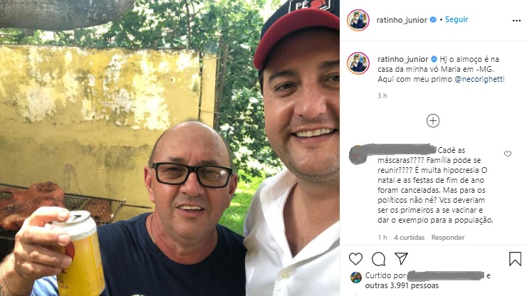 Na postagem no Instagram, o governador disse que o almoço foi na casa de sua avó Maria, em Minas Gerais. Entre os comentários da postagem há críticas à falta de máscaras e à reunião familiar e até um questionamento sobre a quantidade de pessoas no encontro: "Tem somente dez adultos aí?".