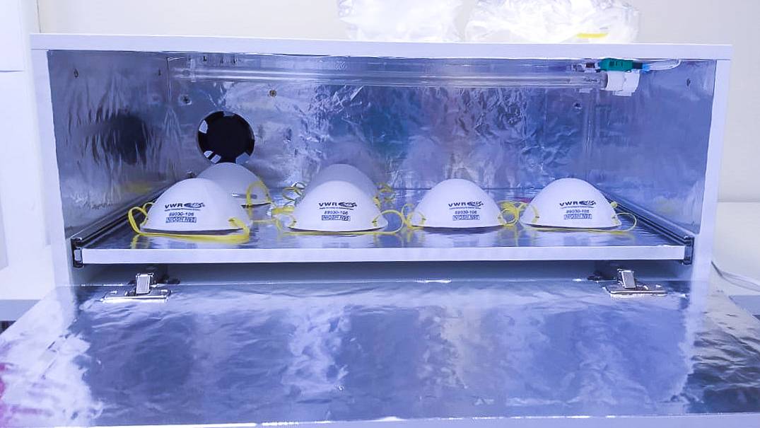 O novo equipamento desenvolvido pela universidade faz a desinfecção das máscaras por meio de radiação ultravioleta. Uma câmara com lâmpadas germicidas emite radiação que inativa materiais genéticos e acaba por matar o vírus. Com esse procedimento, a vida útil das máscaras N95 aumenta em três vezes.