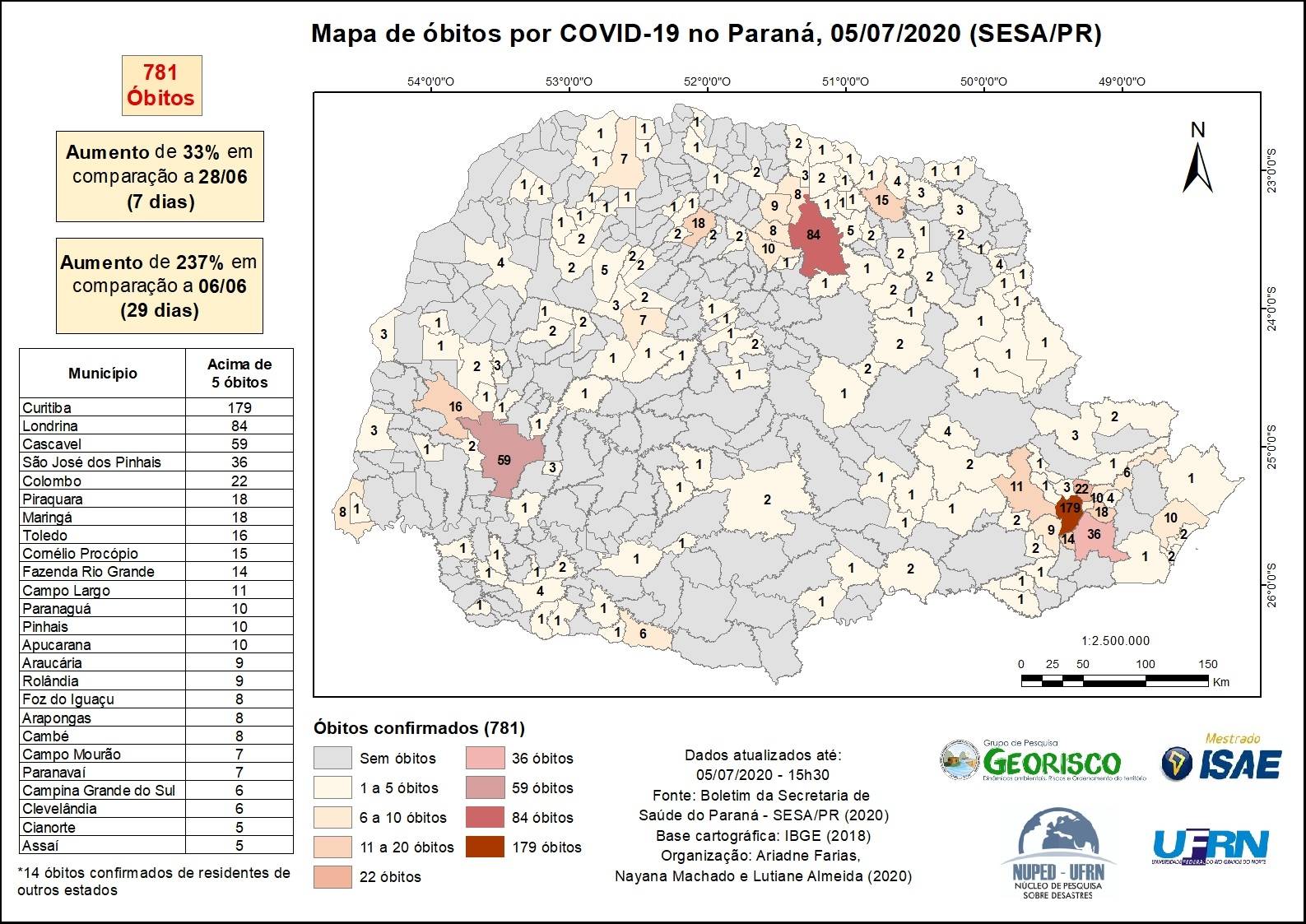 No acumulado, o Paraná tem 194,5 mortes para cada 100 mil habitantes. É a quarta menor mortalidade do país, à frente apenas de Santa Catarina (189,4), Mato Grosso do Sul (164,8) e Minas Gerais (156,1). As maiores mortalidades foram registradas em Roraima (888 mortes por 100 mil habitantes), Ceará (864, Rio de Janeiro (807,5) e Amazonas (804,7).