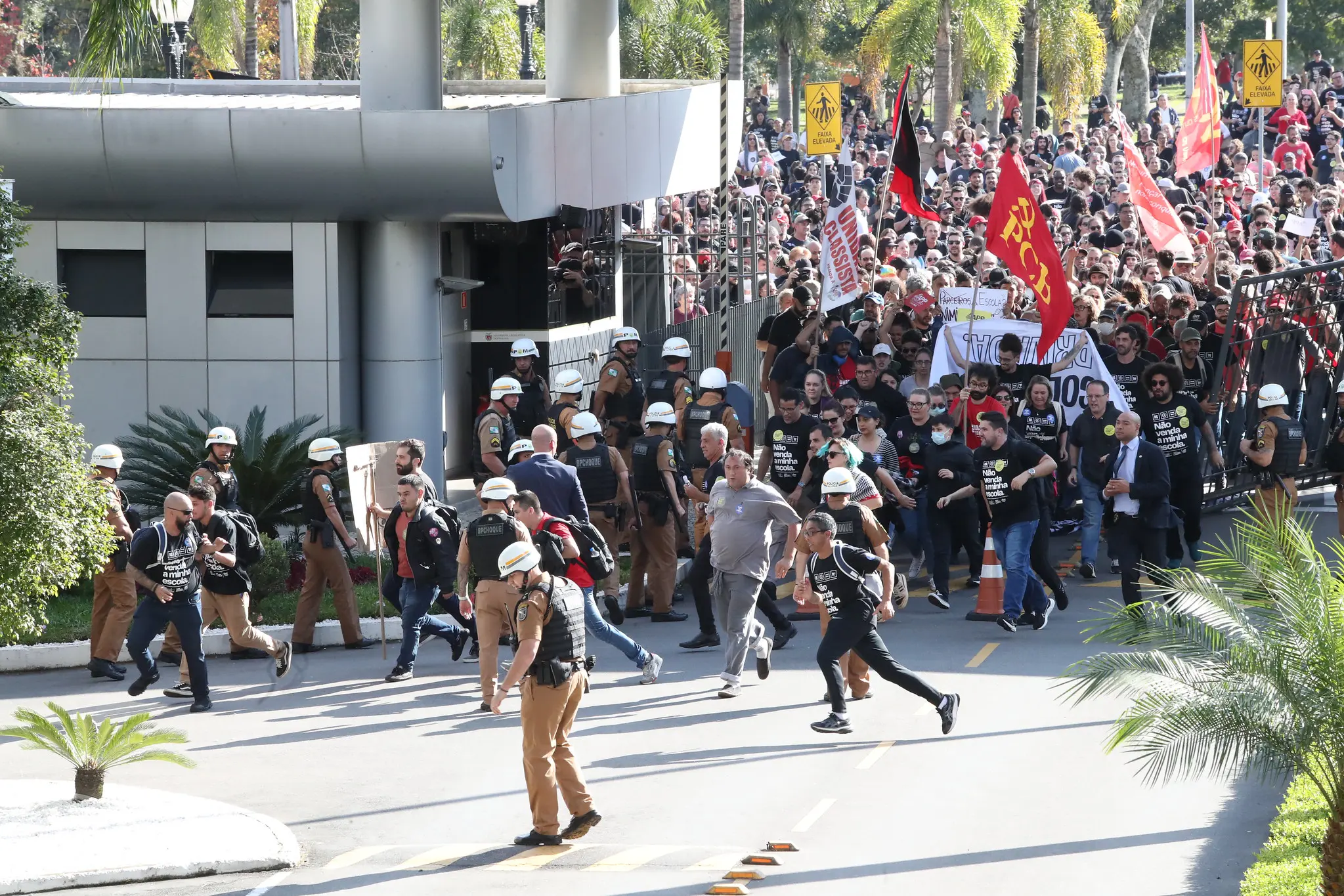A aprovação do projeto de lei que institui o programa “Parceiro na Escola” foi marcada pela invasão da Assembleia Legislativa do Paraná (Alep) nesta segunda-feira (3), quando manifestantes derrubaram o portão de acesso ao prédio público, em Curitiba (PR), antes de quebrarem as portas de vidro da Casa para furar o bloqueio da segurança e tomarem as galerias no plenário.