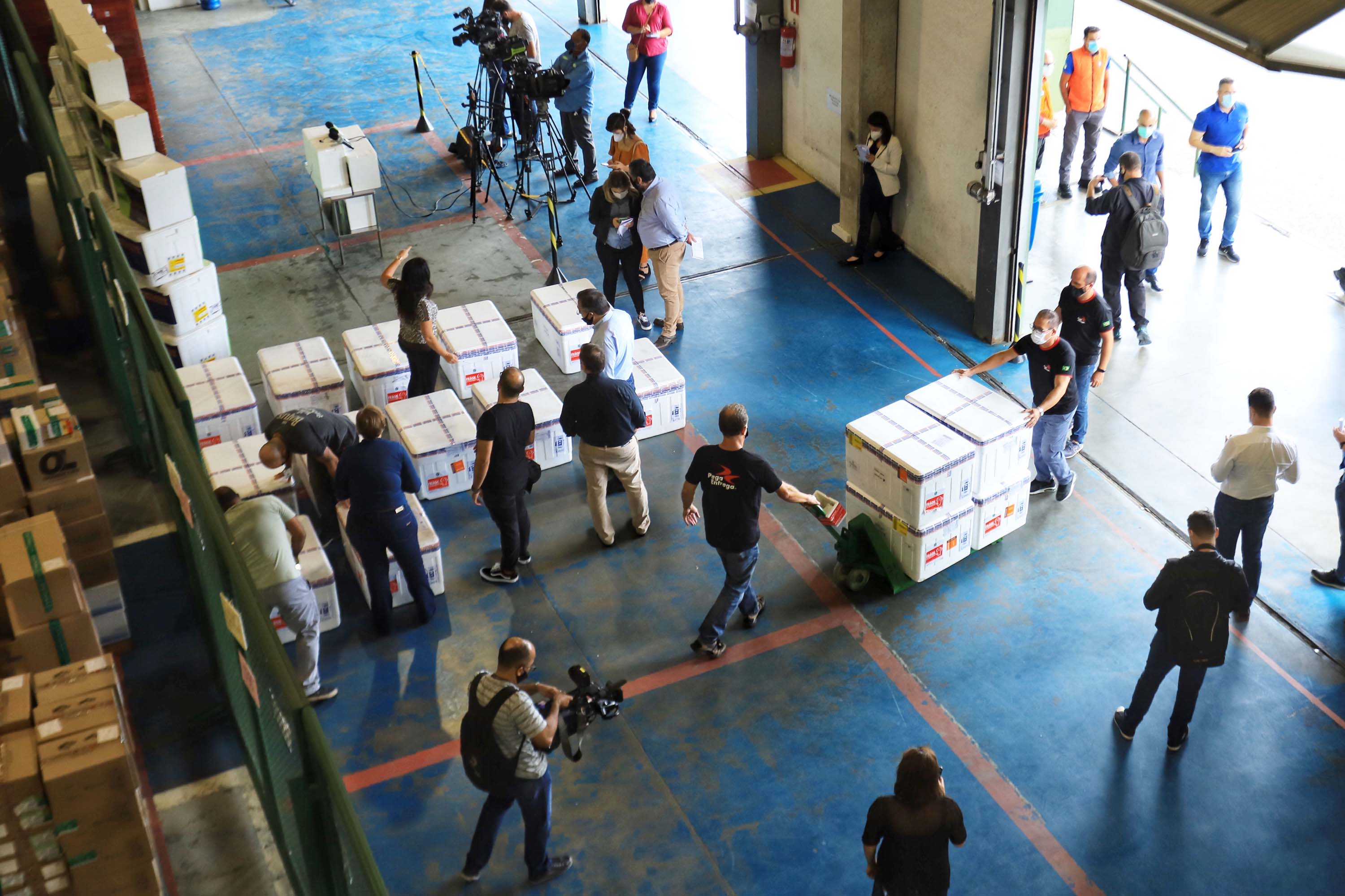 No total, chegaram nesta quinta-feira (1) 492.200 doses da Coronavac, produzida pela Sinovac e Instituto Butantan, e 33.250 doses da Covishield, produzida pela Universidade de Oxford com AstraZeneca e Fundação Oswaldo Cruz (Fiocruz). Foi o maior lote desde o início da campanha da vacinação. Mas a maior parte desta remessa é para garantir a segunda dose: do total de 525.450 doses, apenas 7.832 são para a primeira aplicação.