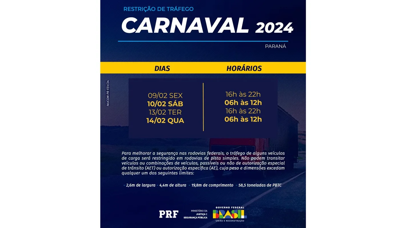 Nesta sexta-feira também entrou em vigor a suspensão temporária de Carnaval de fluxo de caminhões com mais de 2,6 metros de largura, 4,4 metros de altura, 19,8 metros de comprimento ou 58,5 toneladas de peso bruto total em rodovias federais de pistas simples.