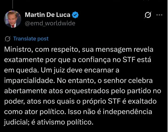 “Um juiz deve encarnar a imparcialidade. No entanto, o senhor celebra abertamente atos orquestrados pelo partido no poder, atos nos quais o próprio STF é exaltado como ator político. Isso não é independência judicial; é ativismo político”, escreveu em sua conta no X, como resposta à postagem original do magistrado.