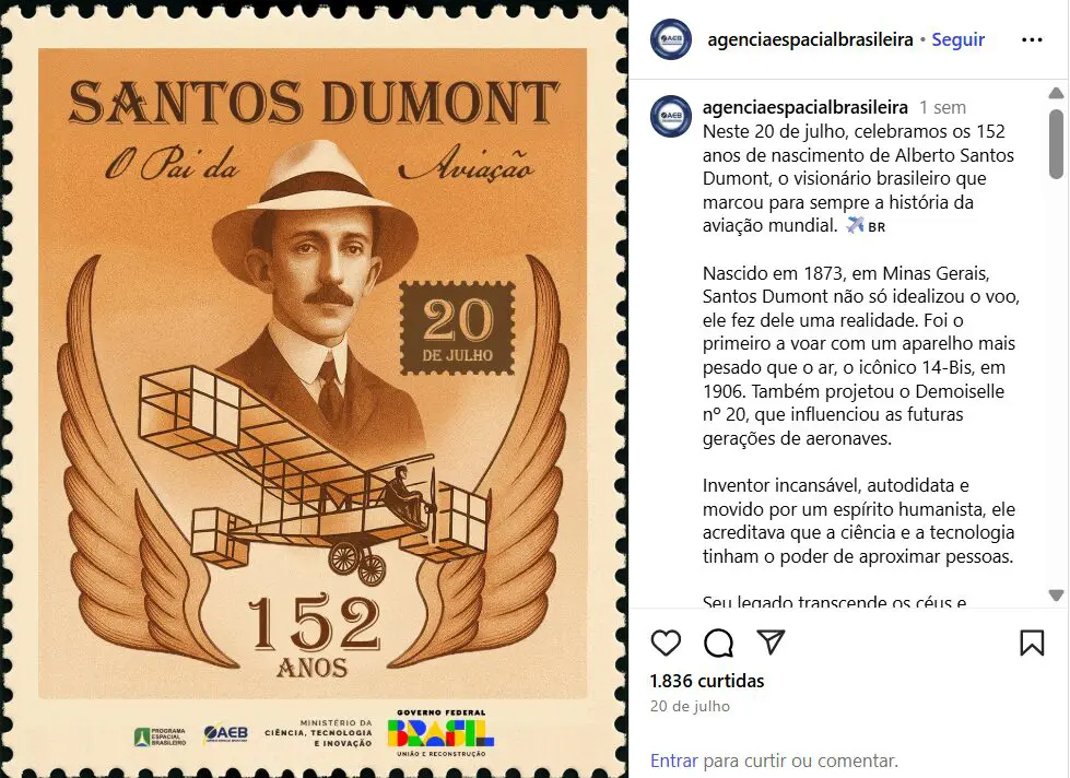 A Agência Espacial Brasileira (AEB) divulgou uma ilustração, no último dia 20, em homenagem aos 152 anos do nascimento de Alberto Santos Dumont (1873-1932) com o aviador brasileiro pilotando sua famosa aeronave 14-Bis ao contrário. A arte foi criada por inteligência artificial e publicada nas redes sociais da agência.