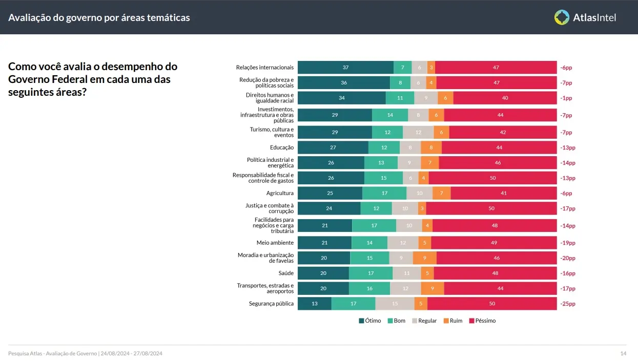 Além da segurança pública e da responsabilidade fiscal e controle de gastos, o terceiro governo de Lula também enfrenta uma desconfiança dos entrevistados nas áreas de meio ambiente, saúde, relações internacionais e redução da pobreza e políticas sociais. Veja abaixo: