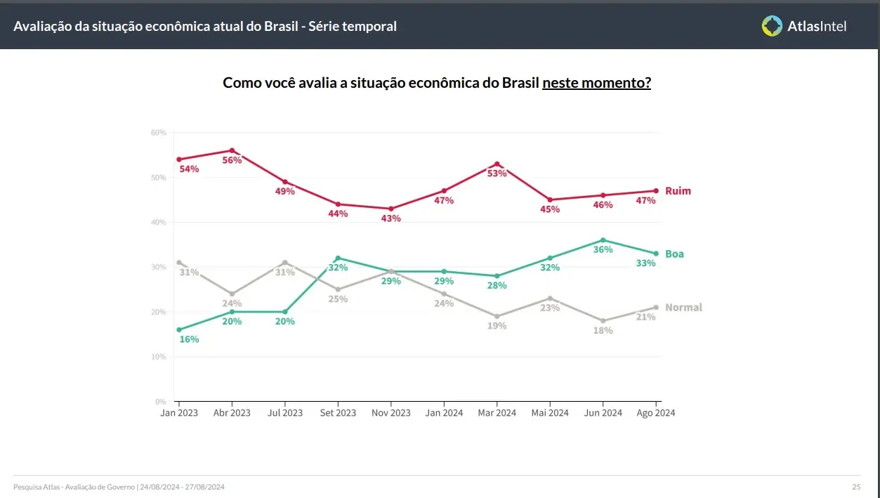 Já a situação econômica do país é avaliada como “ruim” por 47% dos entrevistados, assim como a situação do emprego (44%). A percepção negativa sobre a economia brasileira vem se agravando há três meses:
