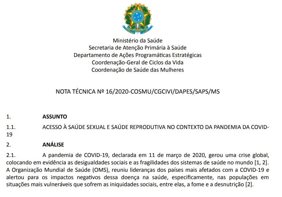 O presidente Jair Bolsonaro criticou, em seu perfil no Twitter, uma nota técnica do Ministério da Saúde que considera como serviços essenciais durante a pandemia o "aborto legal" e a difusão de métodos contraceptivos, como a chamada "pílula do dia seguinte". Segundo ele, o Ministério da Saúde estaria procurando quem seria o autor do documento e chamou o texto de "apócrifo", apesar de ter sido publicado oficialmente pela pasta. Na mensagem, ele reiterou ser contra a legalização do aborto no Brasil. O aborto é crime no Brasil, mas a expressão "aborto legal" da nota quer se referir aos casos em que a interrupção da gravidez não é punida. O Código Penal, em seu artigo 128, prevê que a prática não seja punida nos casos de que a gravidez seja fruto de estupro e quando há risco de vida para a mãe. Em 2012, o Supremo Tribunal Federal decidiu ainda que não deve ser punida a interrupção da gravidez em casos de anencefalia.