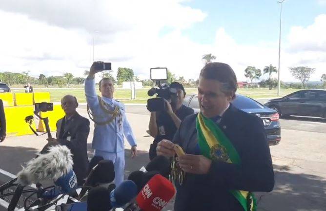 O humorista Márvio Lúcio, conhecido como Carioca, foi enviado pelo presidente Jair Bolsonaro nesta quarta-feira (4) para atender os jornalistas na saída do Palácio da Alvorada (veja o vídeo). O personagem, vestido como presidente da República, chegou ao local em um carro oficial e atendeu a imprensa segurando um cacho de bananas. Em seguida, Bolsonaro chegou e falou apenas com simpatizantes, sem responder sobre o resultado do PIB em 2019.
