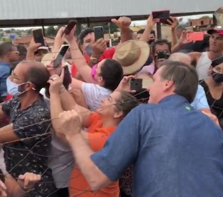 Assim que pousou em um campo de futebol, várias pessoas se aglomeraram para saudar o presidente, conforme revelaram imagens transmitidas pelo líder do PSL na Câmara, deputado Major Vitor Hugo (PSL-GO). O chefe do Executivo cumprimentou várias delas apertando as mãos. Na transmissão, é possível ver que há desde pessoas idosas até crianças. O presidente chegou a pegar um bebê no colo, logo depois de tocar em vários apoiadores. Fizeram parte da comitiva o ministro da Defesa, Walter Braga Netto, e o ex-ministro da Saúde, Eduardo Pazuello.