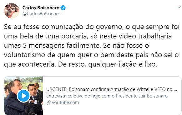 O vereador Carlos Bolsonaro, filho do presidente da República, criticou nesta quinta-feira (19) a comunicação do governo federal. Pelas redes sociais, ao publicar a entrevista de Bolsonaro na saída do Palácio da Alvorada, disse que o órgão "sempre foi uma bela de uma porcaria". Ao ser questionado por um internauta se poderia assumir a comunicação, respondeu: "Não! Obrigado! Jamais foi minha intenção ou aproximação! Tudo que fiz foi por acreditar! Já tenho tudo que sempre quis! Um abraço!". Recentemente, Carlos passou um mês afastado das redes sociais e chegou a ocultar os perfis.
