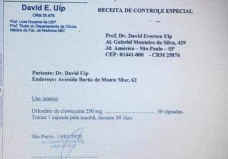 O infectologista e coordenador do Centro de Contingência para o Coronavírus em São Paulo, David Uip, não quis revelar, em coletiva de imprensa nesta quarta-feira (8), se utilizou ou não a cloroquina em seu próprio tratamento, para tratar a Covid-19. A declaração foi dada depois que uma imagem de receita de seu consultório, com a prescrição da substância, começou a ser distribuída nas mídias sociais. Ele confirmou a veracidade do documento, sem dizer se tomou a cloroquina, e usou o momento para pedir “respeito” ao presidente Jair Bolsonaro, que o mencionou em mensagens no Twitter sobre a cloroquina. “Presidente, eu respeitei o seu direito de não revelar seu diagnóstico, respeite o direito de não revelar meu tratamento. A minha privacidade foi invadida. A privacidade da minha clínica foi invadida. Tomarei as providências legais adequadas para a invasão da minha privacidade e dos meus pacientes".