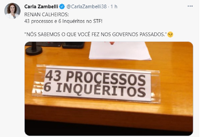 A deputada federal Carla Zambelli (PSL) fez uma publicação em suas redes sociais, nesta quinta-feira (27), exibindo uma placa ironizando o relator da CPI da Covid-19, senador Renan Calheiros (MDB-AL), que vem utilizando nas sessões da Comissão um letreiro com o número de mortos no Brasil em razão do coronavírus. Zambelli confeccionou uma placa semelhante com a inscrição “43 processos; 6 inquéritos”, em alusão às ações que o senador responde.