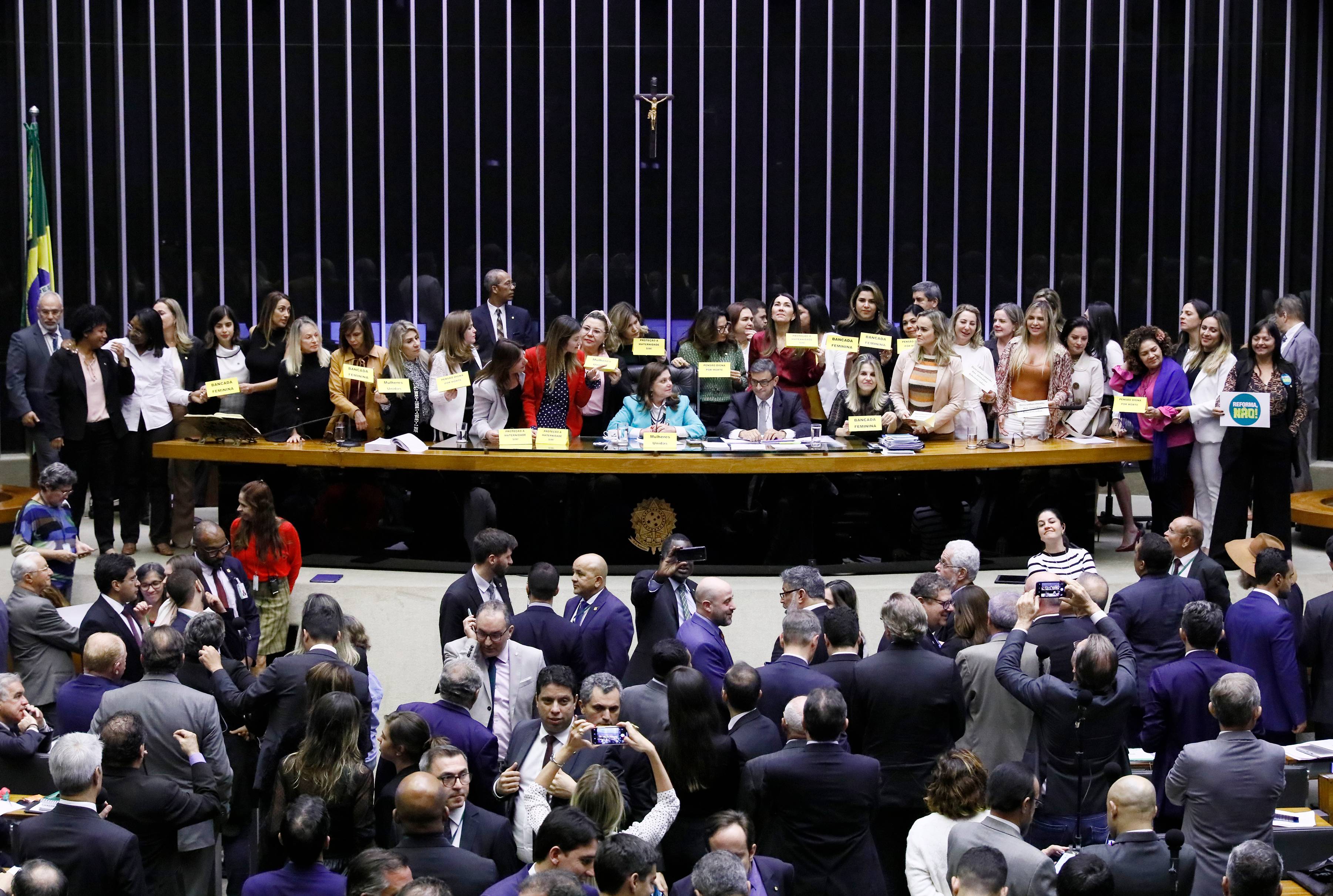 Pouco antes de encerrar a votação em primeiro turno da reforma da Previdência, os deputados rejeitaram três destaques (pedidos de mudança ao texto-base) do PT. Esses destaques reduziriam a economia com a reforma em mais de R$ 160 bilhões. Agora, falta votar somente o último destaque, do PRB, que é uma emenda de redação, já acordada para ser aprovada e sem impacto fiscal.