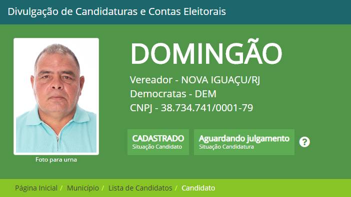 Um candidato a vereador em Nova Iguaçu (RJ) foi morto a tiros na noite de sábado (10) em um bar da cidade. Ele foi alvejado por homens que estariam utilizando toucas "ninja" por volta das 18h30. Domingos Barbosa Cabral, conhecido como Domingão, tinha 56 anos e concorria pelo DEM. Em julho, ele chegou a ser detido por porte ilegal de arma em operação da Polícia Civil contra uma milícia – um irmão dele foi apontado como um dos chefes do grupo. Em 30 de setembro, também em Nova Iguaçu, Mauro Miranda da Rocha, de 41 anos, candidato a vereador pelo PTC, foi morto a tiros em uma padaria.