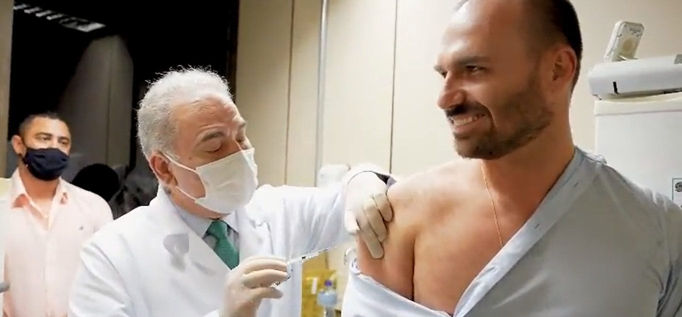 O deputado federal Eduardo Bolsonaro (PSL-SP) foi vacinado contra a Covid-19 nesta quarta-feira (25) pelo próprio ministro da Saúde, Marcelo Queiroga. O parlamentar publicou um vídeo nas redes sociais com o momento da imunização e enfatizou que toda vacina no Brasil foi comprada pelo governo de Bolsonaro. “Graças ao Governo Bolsonaro e ao ministério da Saúde o Brasil bateu hoje a marca de 180 milhões de doses de vacinas aplicadas e +215 milhões já distribuídas - toda vacina no Brasil foi comprada pelo governo Bolsonaro. E hoje também foi a minha vez, ao lado do próprio Min. Marcelo Queiroga”, escreveu.