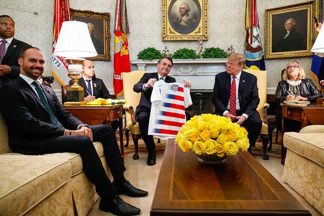 O presidente Jair Bolsonaro disse durante evento nesta quinta-feira (29) que o deputado federal Eduardo Bolsonaro (PSL-SP), seu terceiro filho e candidato à embaixada do Brasil em Washington, vai se encontrar com o presidente norte-americano Donald Trump. Eduardo viaja acompanhado do chanceler brasileiro Ernesto Araújo e será recebido na Casa Branca na sexta-feira (30) pela segunda vez em 2019 - a primeira foi em março, junto durante visita do presidente. Eduardo já tem apoio do governo Trump para representar o Brasil na embaixada. Na fala, Bolsonaro ainda agradeceu Trump pelo apoio junto ao G7. Na semana passada, Trump disse que Bolsonaro faz um ótimo trabalho e que tem total apoio do governo americano no combate às queimadas na Amazônia.