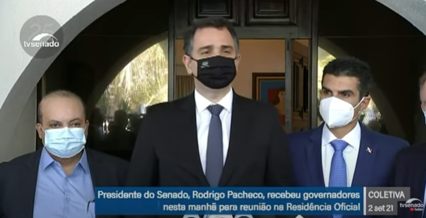 Após encontro com governadores nesta quinta-feira (2), o presidente do senado, Rodrigo Pacheco (DEM-MG), afirmou que é importante respeitar as divergências na busca de consensos, mas que a democracia é inegociável. “É muito importante que todos nós estejamos unidos, respeitando as divergências, na busca de consensos, na busca de convergências, mas com um aspecto que é para todos nós inegociável: não se negocia a democracia. A democracia é uma realidade, o estado de direito é uma realidade. A sociedade já assimilou esses conceitos e esses valores nacionais, de modo que estaremos sempre todos unidos neste propósito de preservação da democracia no nosso país," declarou o presidente do Senado. “É fundamental e pilar da democracia o diálogo. Não é possível se interromper o diálogo com nenhum dos Poderes e nenhuma das instituições”, finalizou.