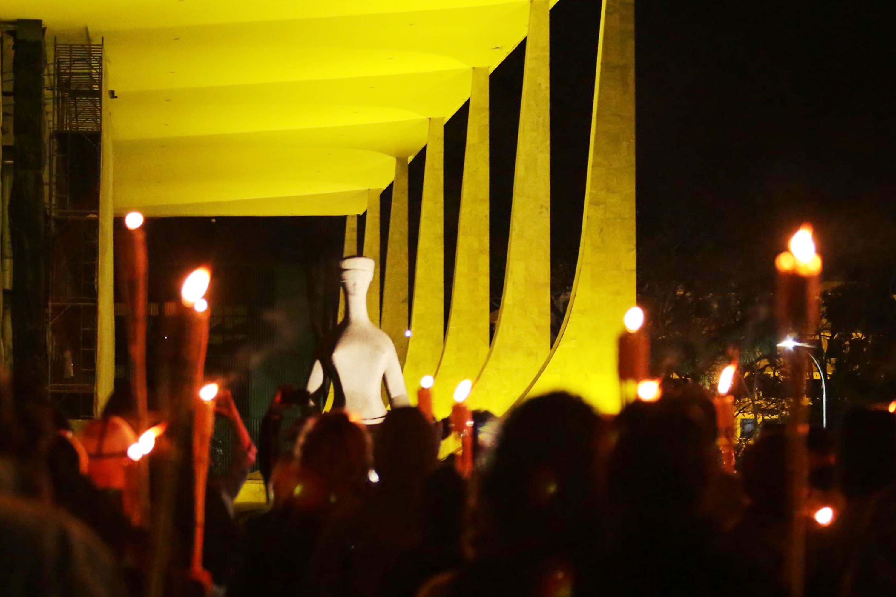 Pouco antes do fechamento da Esplanada dos Ministérios para veículos e pedestres a partir da 0h deste domingo, cerca de 20 manifestantes bolsonaristas autodenominados "300 do Brasil" simularam com fogos de artifício um ataque ao Supremo Tribunal Federal (STF). Os fogos foram disparados às 21h30 na direção do edifício principal do STF, na Praça dos Três Poderes, enquanto os manifestantes xingavam ministros da Suprema Corte. Esse foi o último da sequência de atos realizados ontem pelo grupo liderado pela militante Sara Winter, ex-assessora de confiança da ministra Damares Alves, da Mulher, da Família e dos Direitos Humanos. "Isso para mostrar ao STF e ao (Governo do Distrito Federal) GDF que nós não vamos arregar. Repararam que o ângulo dos fogos está diferente da última vez? Se preparem, Supremo dos bandidos", ameaçou um manifestante em vídeo nas redes sociais. Em suas redes sociais, Sara Winter acusou o governador Ibaneis Rocha de "ditador" e cobrou a revogação do decreto que fechou a Esplanada, "Revogue agora mesmo esse decreto inconstitucional ou haverá consequências! Se você tirar o direito de ir e vir do povo, tiraremos o seu também!", escreveu.