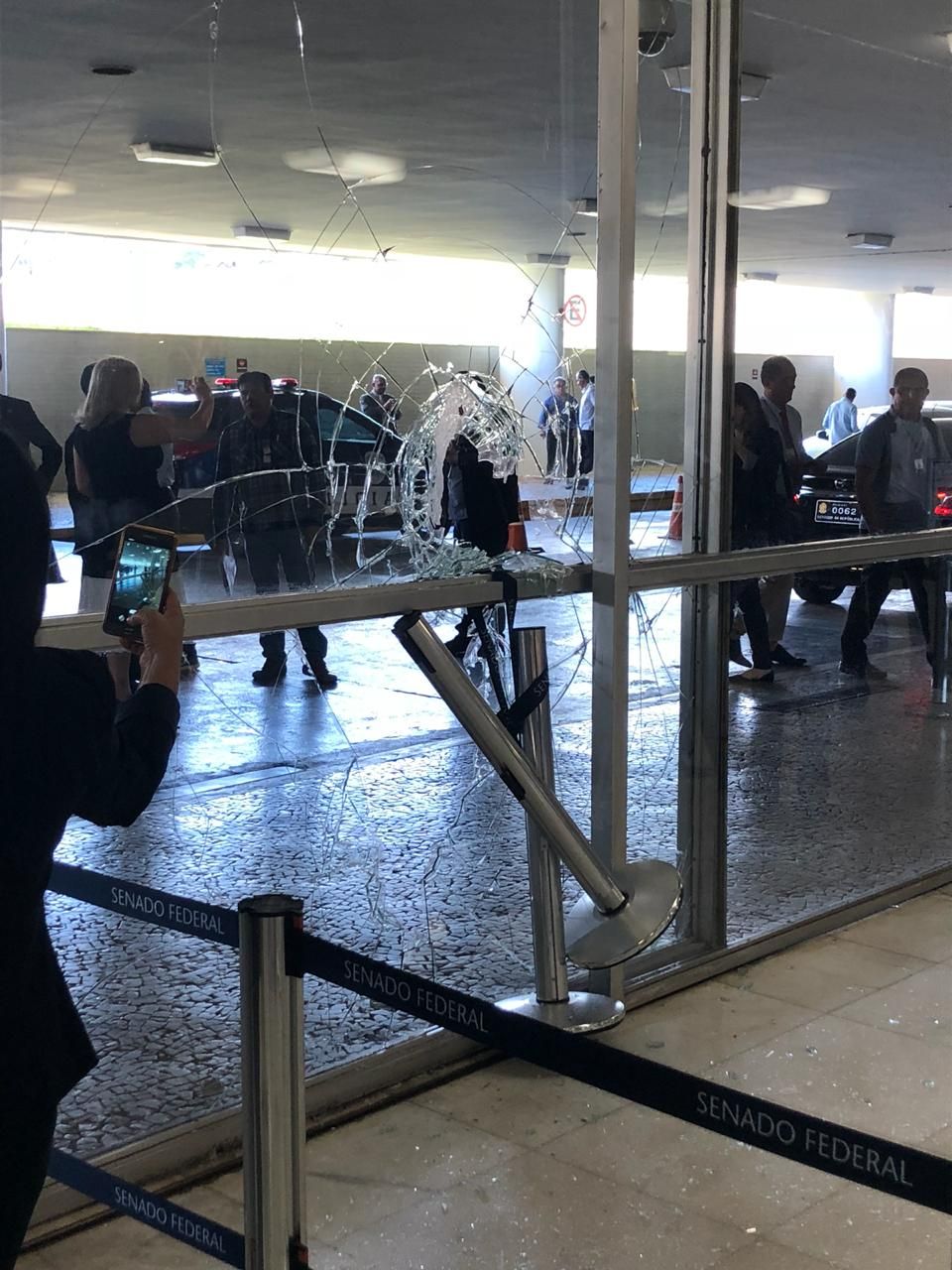 Um homem quebrou uma das portas de vidro da entrada do Senado Federal, em Brasília, no começo da tarde desta quinta-feira (29). Segundo testemunhas, ele estava na fila para entrar no prédio, mas foi impedido pelos seguranças, porque não tinha agendado a visita. O homem teria dito: "Vocês não vão me deixar entrar na casa do povo?". Minutos depois, ele voltou com um objeto de metal e o arremessou contra uma das portas (veja foto).