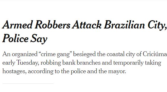 A imprensa internacional repercute nesta terça-feira (1º) o assalto a banco em Criciúma, em Santa Catarina, durante a madrugada. Cerca de 30 homens armados fecharam diversos acessos à cidade e provocaram incêndios para impedir a chegada de mais viaturas da polícia. Eles fugiram em comboio levando uma quantia em dinheiro ainda não contabilizada.