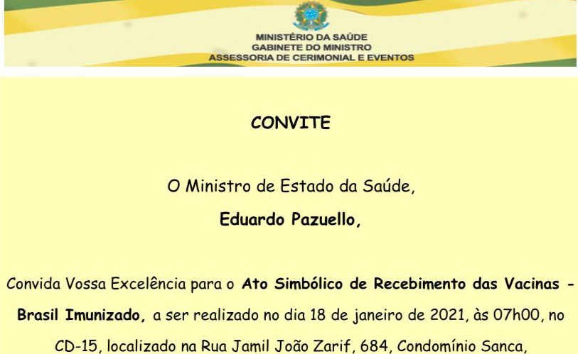 A governadora do Rio Grande do Norte, Fátima Bezerra (PT), publicou no Twitter a cópia da mensagem enviada pela pasta. "Acabo de receber do Ministério da Saúde o convite para o ato simbólico de entrega das vacinas que iniciarão a imunização dos brasileiros e brasileiras", disse.