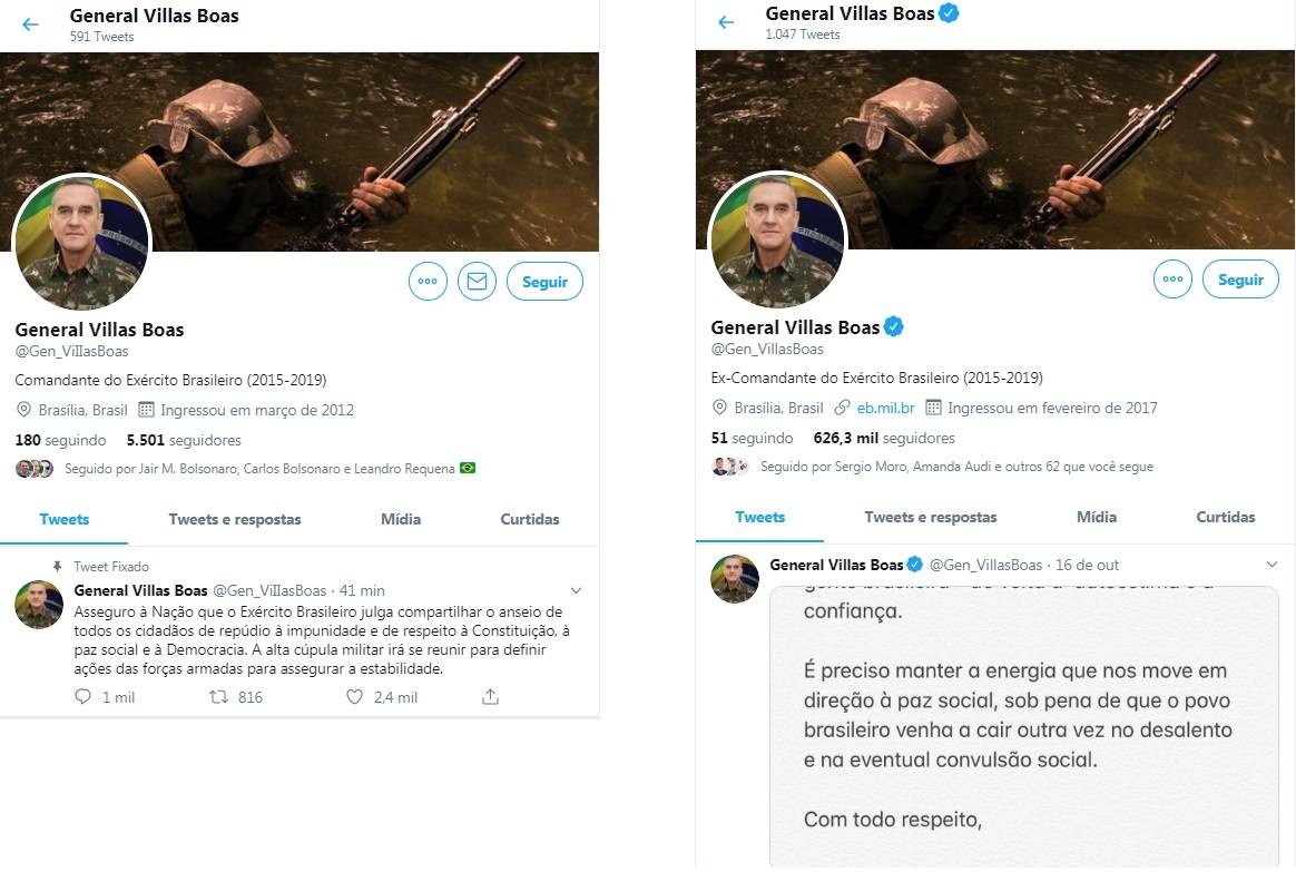 O perfil oficial do general, com a conta verificada pelo Twitter é @Gen_VillasBoas. A conta falsa repetiu o mesmo usuário, substituindo as duas letras “L” por “I” maiúsculo, o que dificulta a identificação, ficando @Gen_ViIIasBoas. A conta fake também usa a mesma foto da conta oficial do general. O perfil falso é seguido pelo presidente Jair Bolsonaro (PSL) e por seu filho, Carlos Bolsonaro.