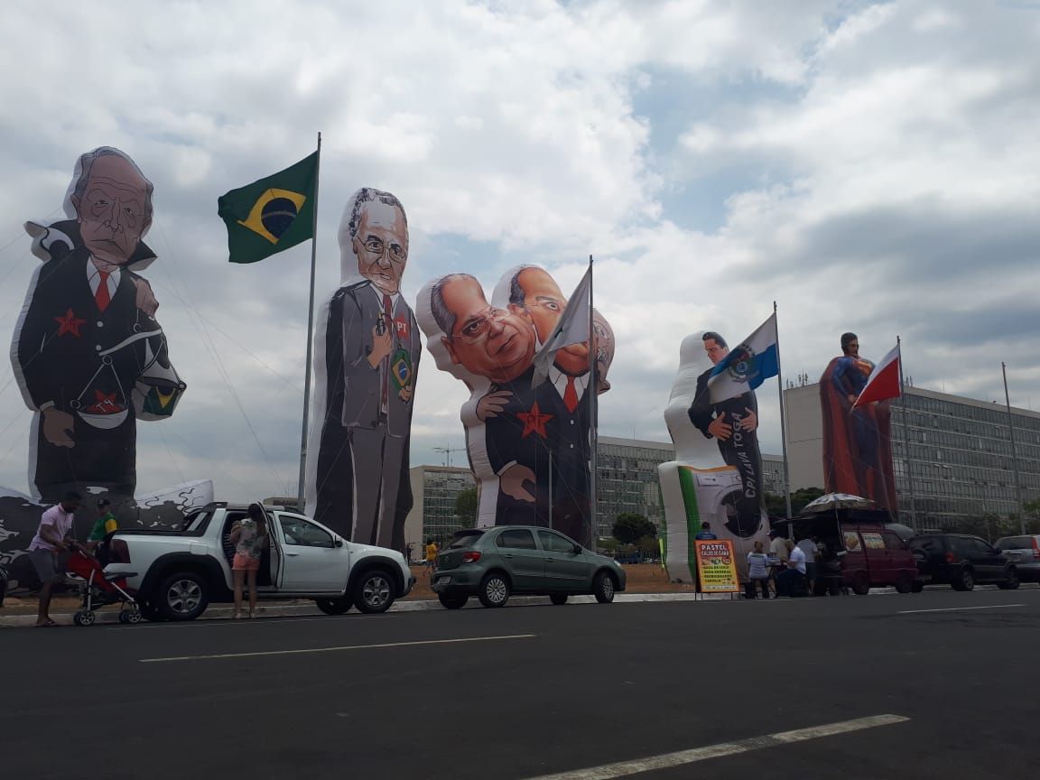 O presidente do Senado, Davi Alcolumbre (DEM-AP), teve um boneco inflável gigante instalado no gramado da Esplanada dos Ministérios nesta quarta-feira (25), em frente ao Congresso. O boneco, chamado de pixuleco, aparece com uma máquina de lavar roupa e uma faixa com a inscrição "CPI da Lava Toga" – em referência à comissão no Senado que pretende investigar o Judiciário, mas foi barrada por Alcolumbre. O pixuleco está ao lado de outros bonecos: Ricardo Lewandoski e Gilmar Mendes, ministros do STF; do senador e ex-presidente do Senado, Renan Calheiros; do ex-ministro petista, José Dirceu; do ex-presidente Lula, condenado na Lava Jato; e do ministro da Justiça e Segurança Pública, Sergio Moro.