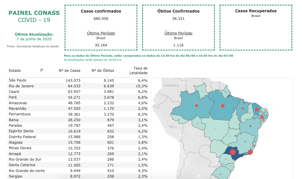 O Conselho Nacional dos Secretários de Saúde (Conass) lançou neste domingo (7) o Painel Conass, um site com números consolidados da pandemia de covid-19 no Brasil. Os dados terão informações coletadas nos 26 estados e no Distrito Federal. A entidade "pauta sua atuação pelo mais alto interesse público, respeito à diversidade e pluralismo democrático. Nosso valor maior é a vida. A defesa da saúde e da vida é nosso compromisso inabalável com os brasileiros. Tendo a democracia como princípio, o Conass busca incessantemente o consenso para o fortalecimento do sistema de saúde que todos desejamos", afirmou em nota o presidente da instituição, Alberto Beltrame, secretário de Saúde do governo do Pará.