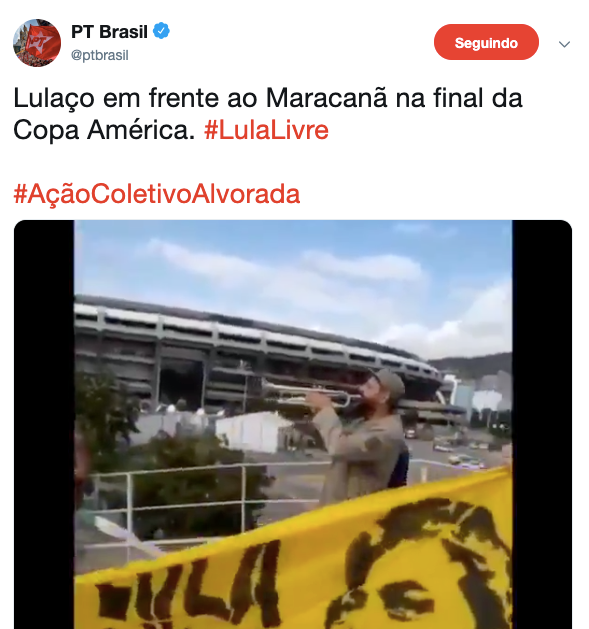 Lulaço em frente ao Maracanã na final da Copa América. #LulaLivre#AçãoColetivoAlvorada pic.twitter.com/WLY6e8yWZs— PT Brasil (@ptbrasil) 7 de julho de 2019