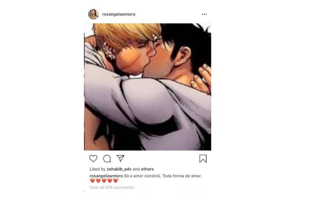 A advogada Rosângela Moro, mulher do ministro da Justiça, Sergio Moro, postou em seu perfil no Instagram a imagem do beijo gay do gibi dos Vingadores que sofreu tentativa de apreensão pela Prefeitura do Rio, na Bienal do Livro. Em seguida, ela apagou a postagem por causa das críticas recebidas dos internautas.