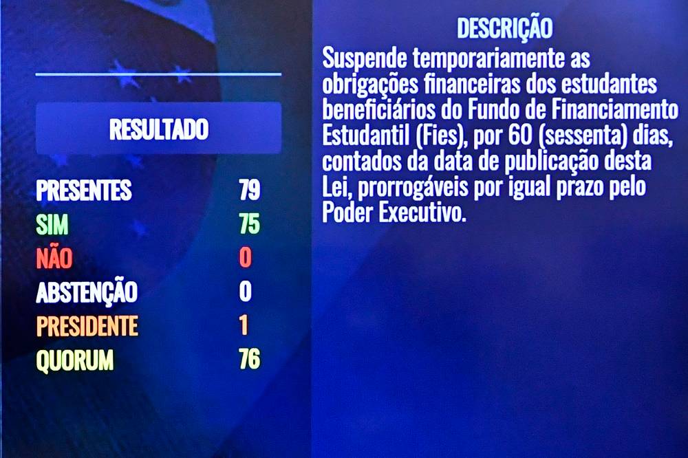 O Senado aprovou, nesta terça-feira (12), o substitutivo ao Projeto de Lei 1.079/2020 que prevê a suspensão do pagamento das parcelas do Financiamento Estudantil (Fies) durante o estado de calamidade pública decretado por causa da pandemia da Covid-19. O projeto agora voltará à analise da Câmara. Caso seja aprovada, a medida valerá pelo prazo de 60 dias e poderá ser prorrogada pelo mesmo período. O estado de calamidade pública estará em vigor até 31 de dezembro.