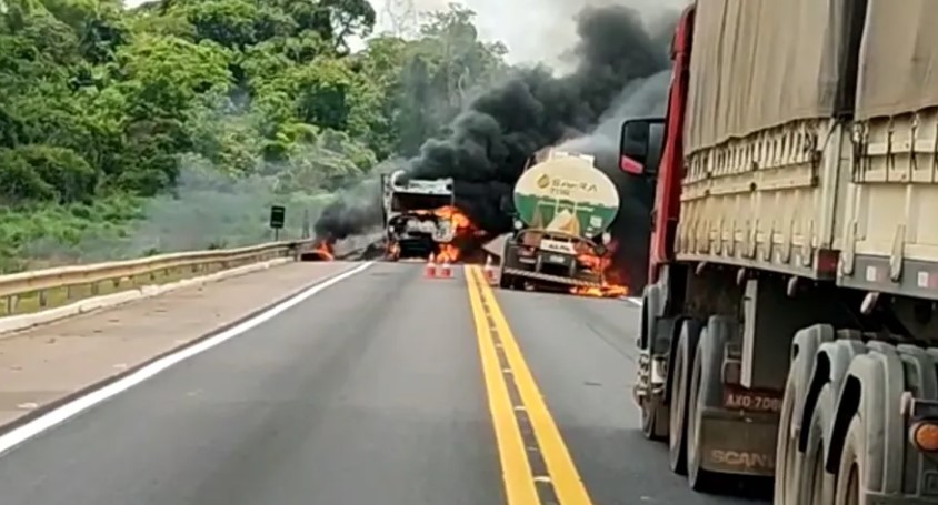 Segundo o boletim mais recente da Polícia Rodoviária Federal (PRF), existem no Mato Grosso quatro bloqueios totais e 11 interdições parciais nas estradas. Vídeos dos caminhões pegando fogo circulam nas redes sociais. Uma das carretas estava carregada de milho e a outra era um caminhão-tanque.