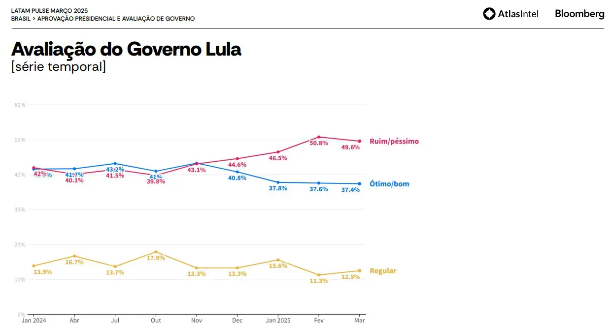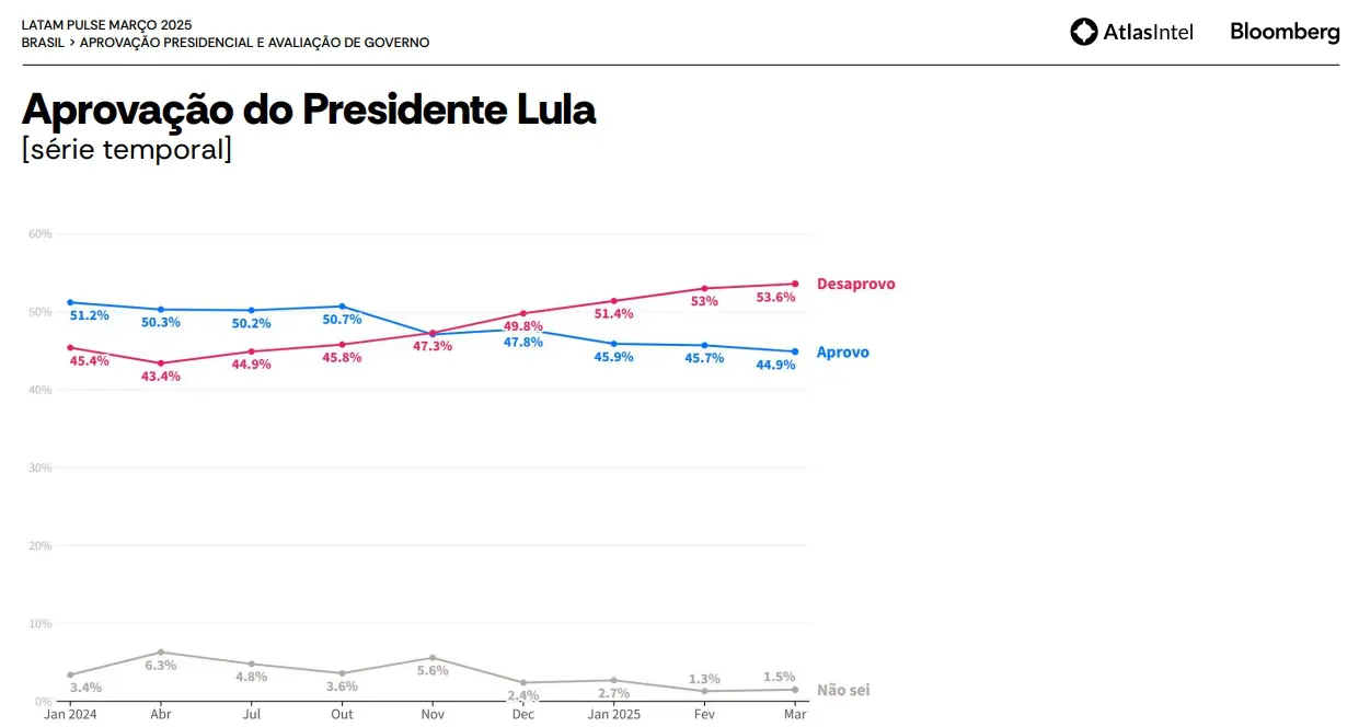 A desaprovação ao governo do presidente Luiz Inácio Lula da Silva (PT) segue em alta por preocupações da população com a economia e a responsabilidade fiscal. A nova rodada da pesquisa AtlasIntel e Bloomberg divulgada nesta terça (1º) mostra a aprovação ao petista ainda em queda, mesmo com o anúncio de medidas para tentar reverter a perda de popularidade.