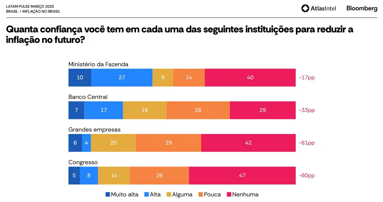Por outro lado, a pesquisa mostra uma alta desconfiança sobre qual instituição pública ou privada poderia ajudar a reduzir a inflação. O Congresso não tem nenhuma confiança para 47% dos entrevistados, enquanto que 27% acreditam no Ministério da Fazenda: