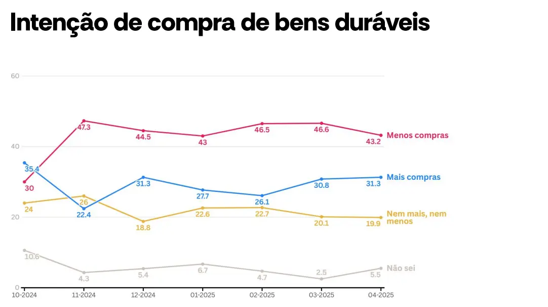 Com isso, a intenção de compras de bens duráveis também está começando a reagir e já soma 31,3% dos entrevistados. No entanto, 43,2% ainda acreditam fazer menos compras e 19,9% nem mais e nem menos:
