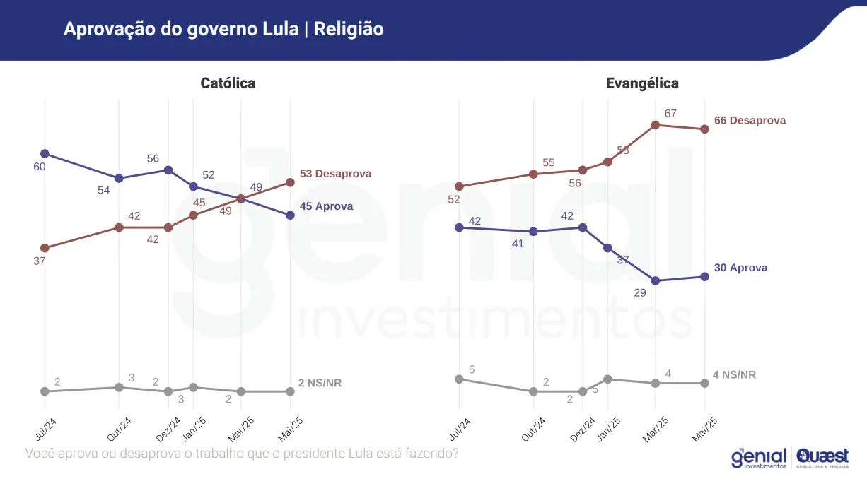 Outro levantamento divulgado nesta semana, do Poder360, mostrou um cenário parecido em que 48% dos católicos desaprovam Lula, contra 45% de aprovação. Já entre os evangélicos, esse quantitativo é de 70% a 25%, respectivamente.