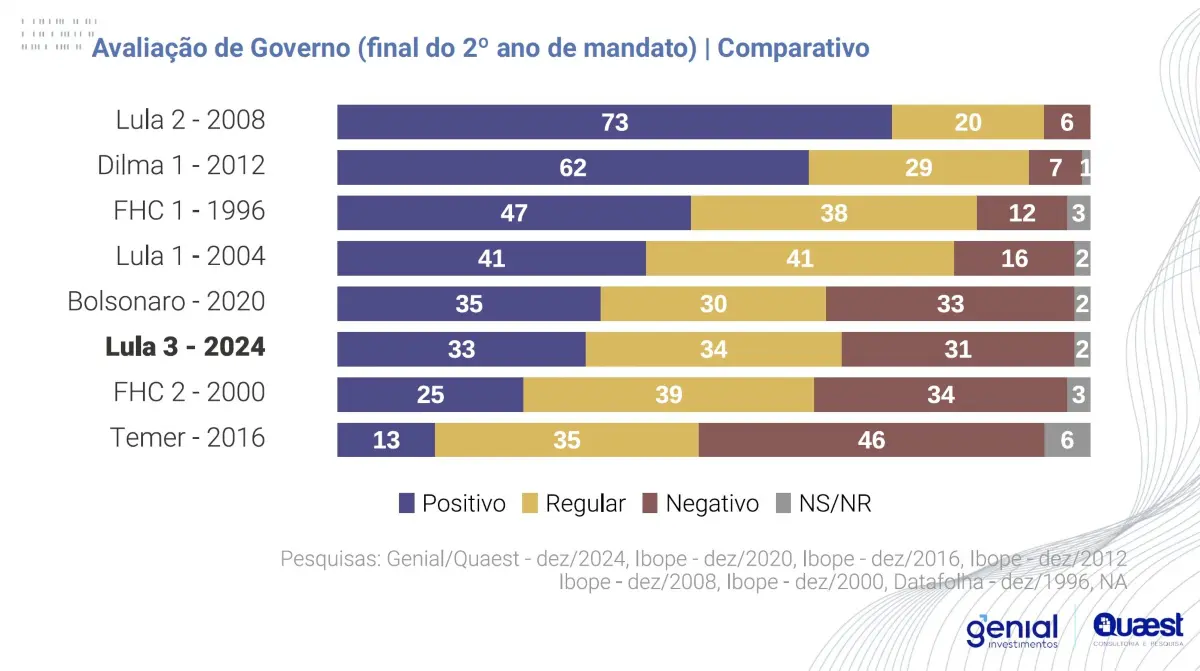 De acordo com o pesquisador Felipe Nunes, CEO da Quaest, a avaliação deste terceiro governo de Lula é pior do que as duas primeiras gestões e só aparece à frente de Fernando Henrique Cardoso (PSDB) 2 e Michel Temer (MDB).