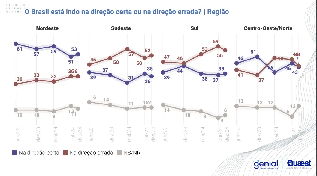 Por outro lado, a percepção de que o Brasil está indo na direção correta (43%) ainda desperta a desconfiança de grande parte dos entrevistados pela Quaest (46%), também refletido nas diferentes regiões do país: