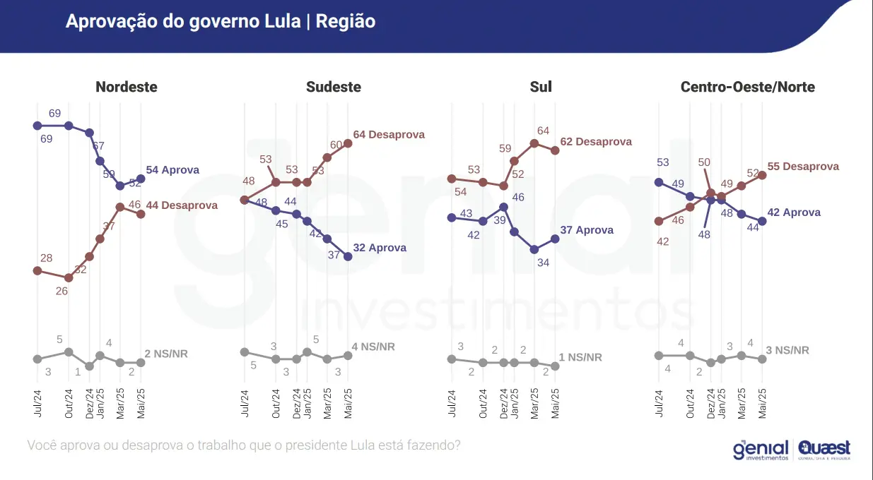 Nas demais regiões, a aprovação de Lula segue em tendência de queda no Sudeste (32%) e no Centro-Oeste/Norte (42%), enquanto que no Sul ensaia uma recuperação (37%).
