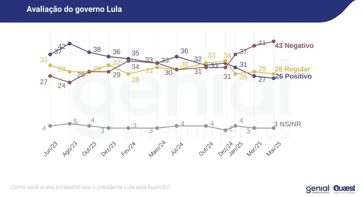 Os levantamentos realizados pelo Poder360 e pela Quaest mostram uma desaprovação de 56% e 57%, respectivamente, enquanto que Lula é aprovado por apenas 39% e 40% dos entrevistados.