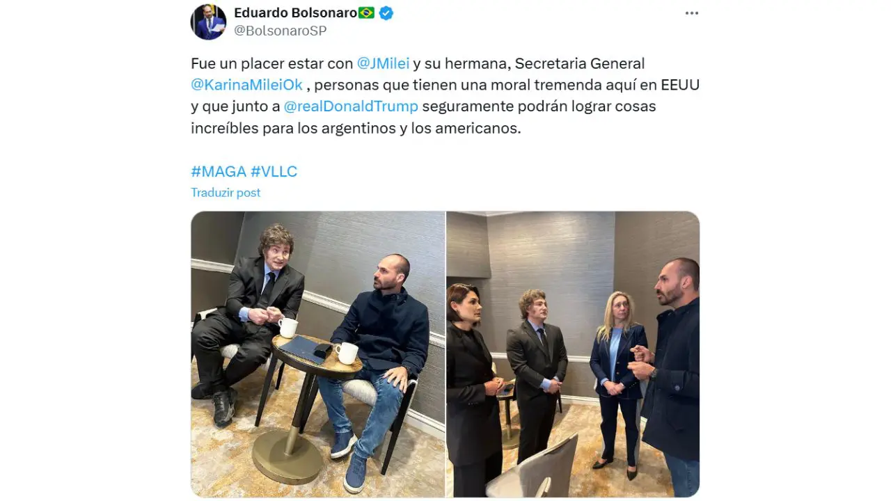"Satisfação encontrar com o Milei e sua irmã Karina, pessoas que estão com uma moral tremenda aqui nos EUA e certamente junto com Donald Trump poderão fazer realizações incríveis para argentinos e americanos", escreveu o parlamentar em um post no X.