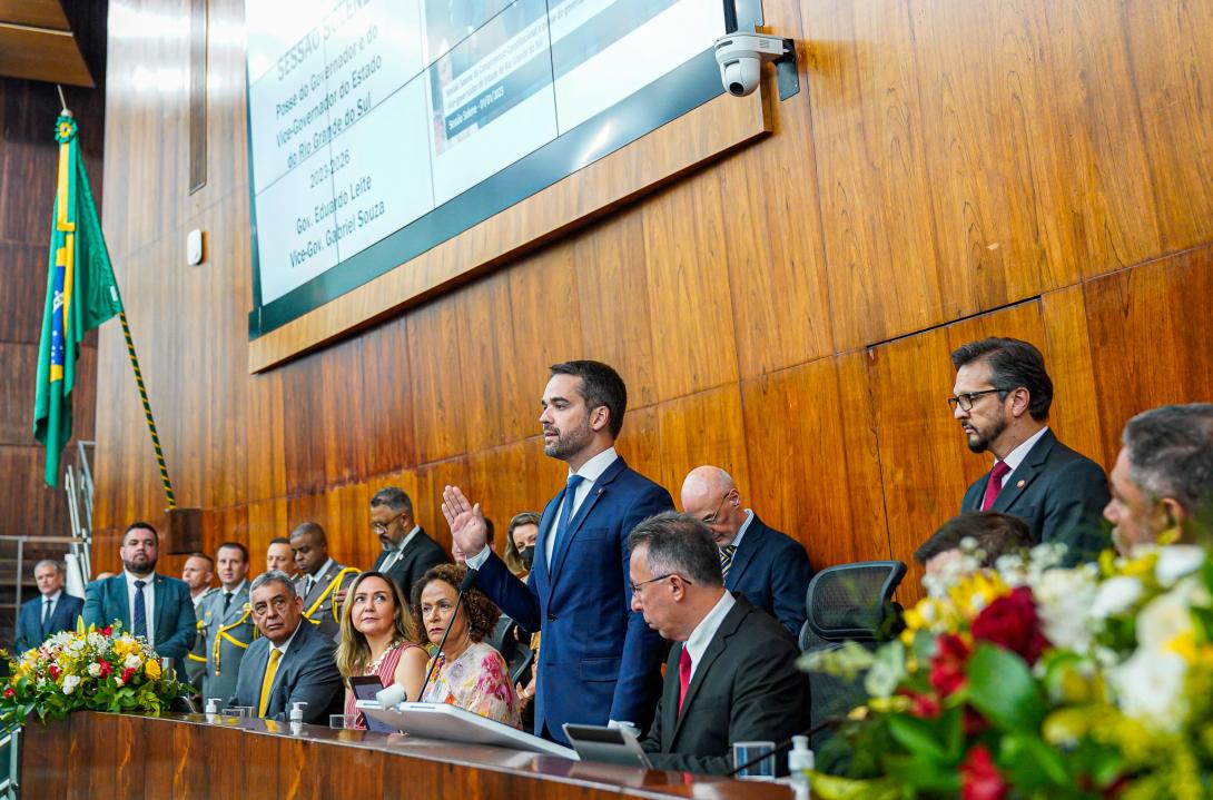 O governador reeleito, Eduardo Leite (PSDB), e o vice-governador, Gabriel Souza, tomaram posse na Assembleia Legislativa do Rio Grande do Sul, neste domingo (1°). Em seu discurso, o governador destacou o equilíbrio fiscal com a redução de impostos, qualificação nos equipamentos culturais, programa de transferência de renda e melhorias nas rodovias em seu mandato anterior.