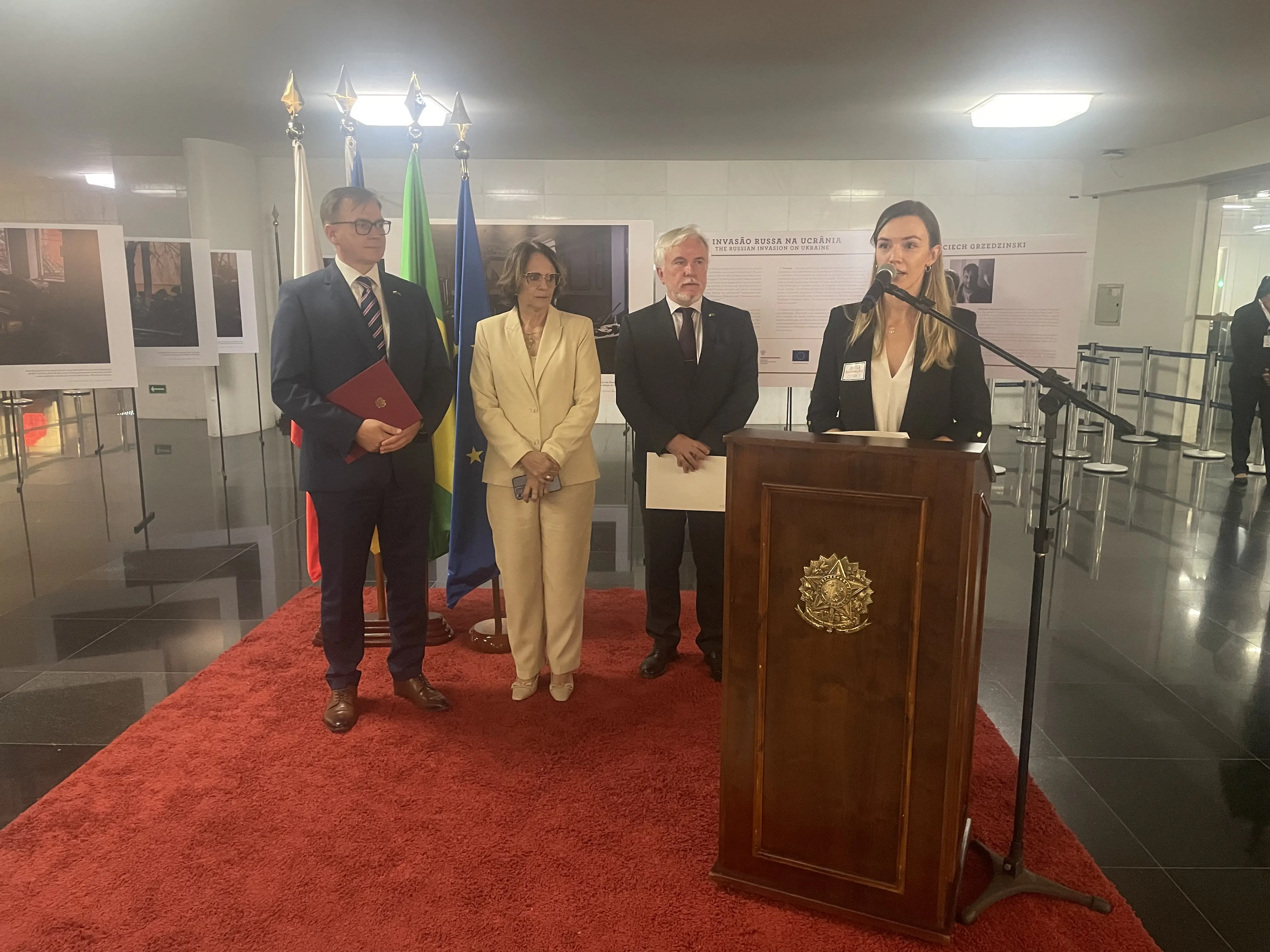 "Ao trazer essas imagens para o interior do Parlamento brasileiro, reafirmamos nossos compromissos com a verdade e memória e a defesa do direito internacional. O evento de hoje também simboliza a solidaridade entre Ucrânia e Polônia. Desde os primeiros dias da invasão em larga escala da Rússia na Ucrânia, a Polônia demonstrou um apoio sem precedentes a nosso país e ao nosso povo", disse o chefe da embaixada da Ucrânia, Oleg Vlasenko.
