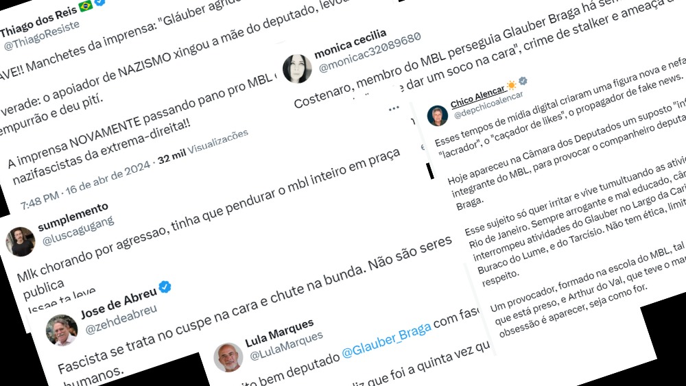 Outro perfil criticou a cobertura do caso e acusou a imprensa de “passar pano para o MBL e para as táticas nazifascistas da extrema-direita”. Em um comentário à publicação, outro usuário do X completou: “Por isso, temos que encontrar um meio de não dar mais palco para imprensa no Brasil”.