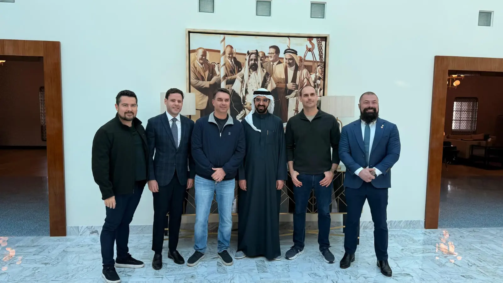 O senador e pré-candidato à Presidência da República Flávio Bolsonaro (PL-RJ) foi recebido no palácio do príncipe Khalid bin Hamad Al Khalifa, no Bahrein, em meio às articulações de pré-campanha em torno de líderes conservadores internacionais. O desembarque ocorreu nesta quinta-feira (29), em um aeroporto exclusivo da família real. Acompanham o senador o ex-deputado federal Eduardo Bolsonaro (PL-SP), o deputado federal Paulo Bilynskyj (PL-SP) e o deputado federal Rodrigo Valadares (União-SE).